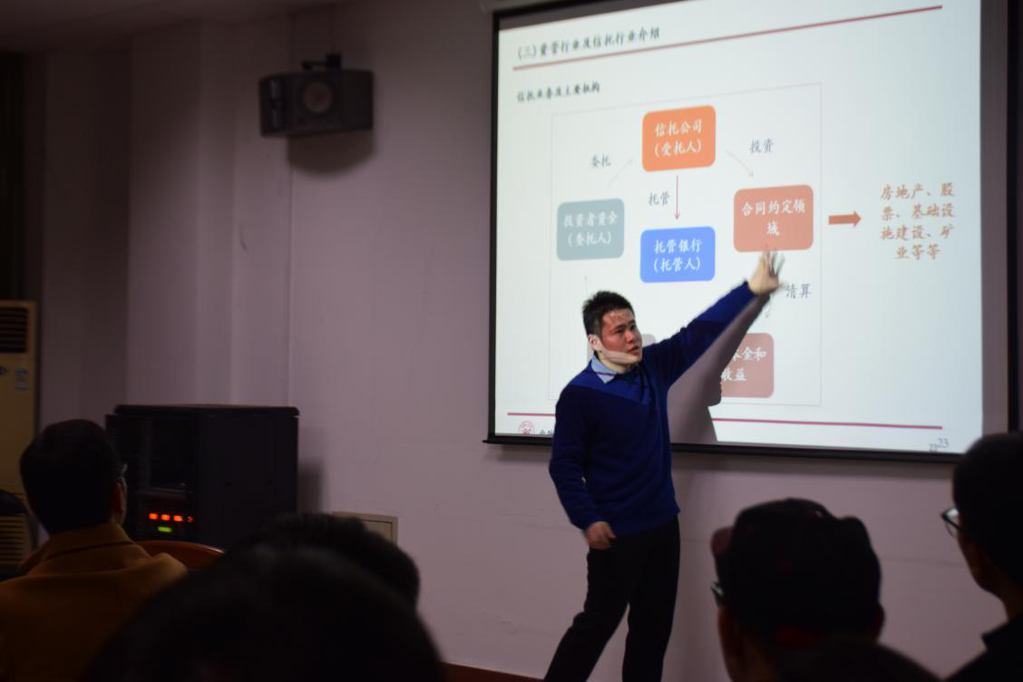 其次,他向我们介绍了金融行业、资管行业与信托行业的主要机构、主要业务、岗位任务与行业前景等,为具有不同未来职业规划的同学详细讲解了这些行业的运行规则以及不同岗位的用人要求,并且要尽早考取相关证书以及培养所需要的职业素质。最后他也希望年轻的血液加入到他们的行业中,并向我们提供了一些实习岗位。