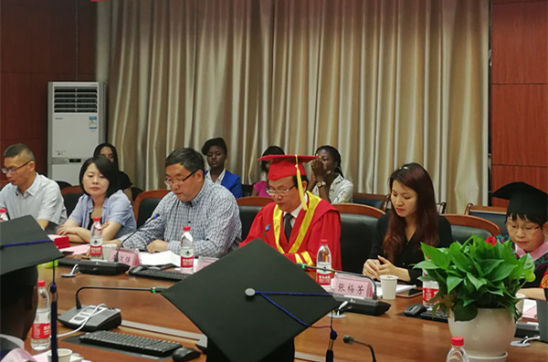 2019届留学研究生毕业典礼在210会议室举行。校党委副书记黄建新、研究生院副院长张梅芳、国际学院副院长李汉强、校友办副主任孙莹、学院领导、导师代表以及来自印度尼西亚、乌克兰、加纳等7个国家的毕业生和家长们参加毕业典礼。