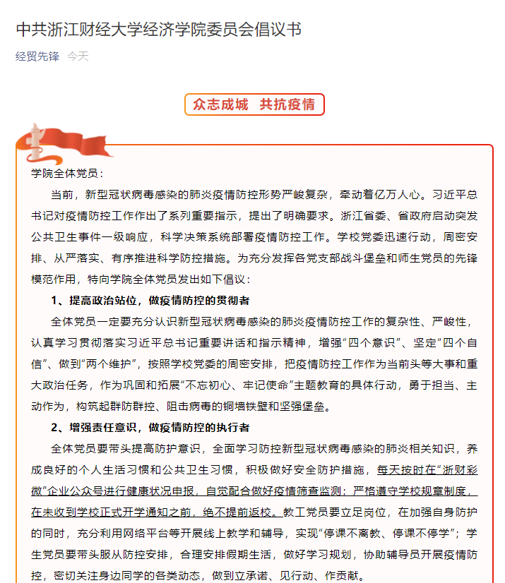 在线上,学院积极向全体党员、校友发出的倡议,每位师生每日定期健康申报,同时学院组织师生积极参与“经院云+”和“四个一”的系列活动。学院教师通过各种线上渠道给学生进行线上教学,云打卡、云健身、云阅读等线上互动成为了全院学生的线上的“云”必修。学院党委积极号召各位党员通过抒发一段感想、拍摄一组图片、制作一个视频、讲述一个故事等来引导同学们进行防护知识科普宣传,提高群众防护意识。