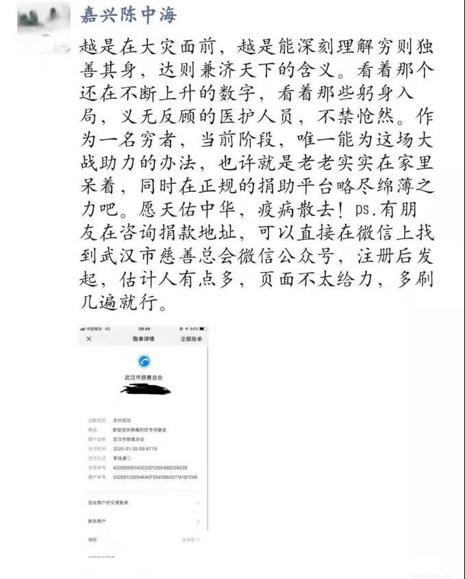 校友也积极响应学院校友会的倡议,发挥了作为一名“浙财经济人”的担当。他们通过各种渠道,用捐赠物资、志愿服务等方式,为社会努力奉献着。林偌嫣校友利用自己所学专业,争当志愿者,专门与巴西、美国等侨胞对接,识别口罩基础信息、翻译文件和海关绿色通道等多重手续申报,将上万只口罩等急需医疗物资顺利运回温州医院;陈牡娟校友为了保障全乡5000余人的生活必需品,挺身而出,每一天她都会根据村民列出的采购清单到县城超市进行采购,然后将所购的生活必需品分发到相应的村民家中。截止目前,陈牡娟校友为村民代购物品的金额已超过15000元。目前学院有30多名校友参与到此次疫情防控工作中。