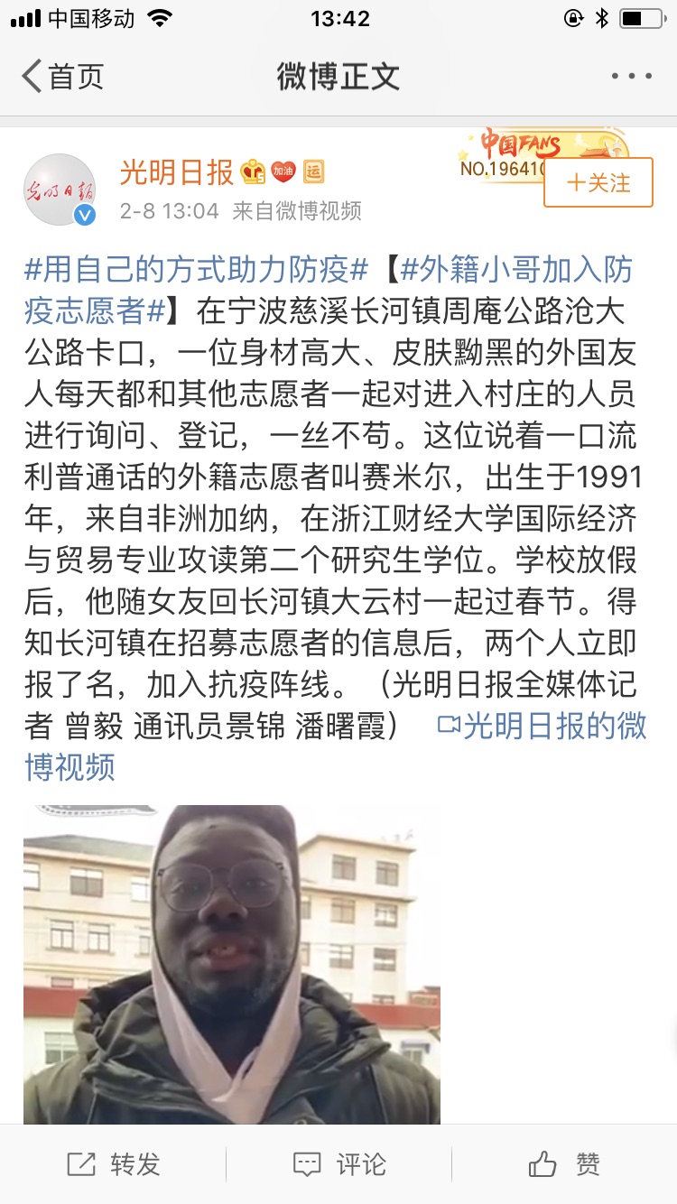 留学生、国际经济与贸易专业研究生塞米尔,得知宁波慈溪长河镇在招募志愿者的信息后,立即报了名,主动参与当地的疫情宣传和防控工作。他说:“疫情当前,不分国籍,大家都应尽自己的一份责任,共同为中国加油。”目前,学院共有50余位师生进行了捐款,金额或物资达到万余元。