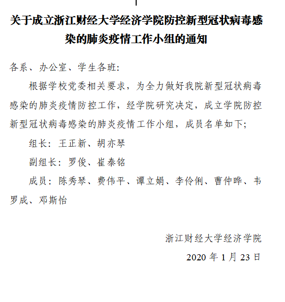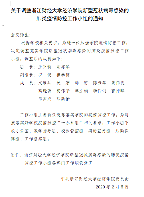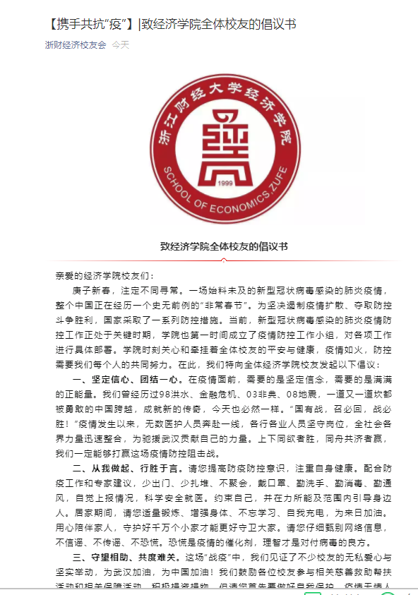 新型冠状病毒感染的肺炎疫情防控工作小组,实行院长、书记为组长的双组长制,并制定落实防控疫情工作实施细则。学院党委面向全体党员,学院校友会面向全体经院人发出倡议,凝聚共识,万众一心,众志成城共同抗“疫情”。同时,学院还推行“一查二摸三跟进”工作法,通过大数据进行云排查,党员带头排摸,一对一跟进,对全院师生共1626人进行地毯式排查,筑牢疫情防线。通过“面、组、线”推进法,进一步压实责任、增强组织合力,确保学校和学院各项防控措施落到实处,为打赢防控阻击战贡献力量。