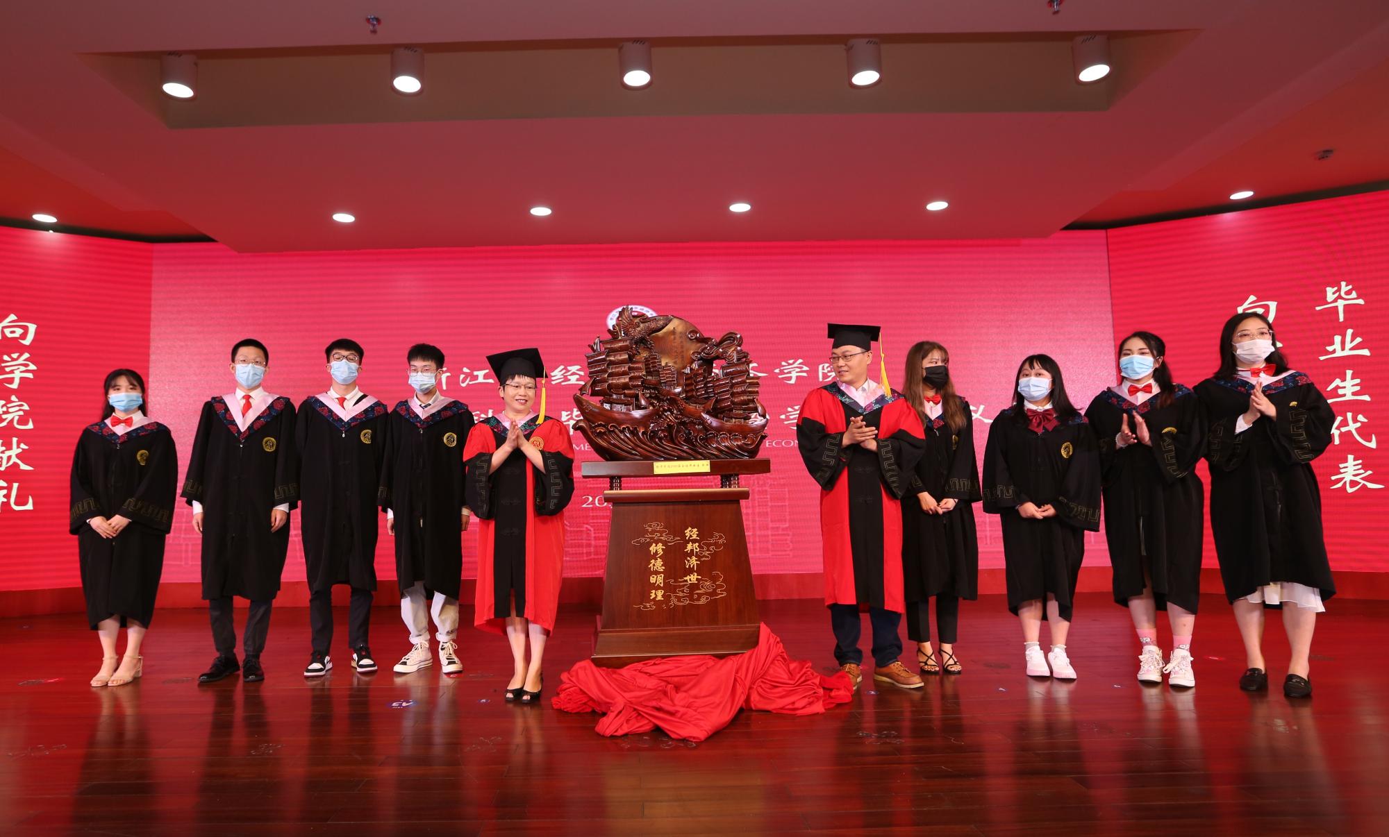 欢快的音乐声响起,毕业生代表向导师献上鲜花,同时导师为毕业生代表佩戴校友校徽,接着毕业生为学院献上“一帆风顺”雕塑。