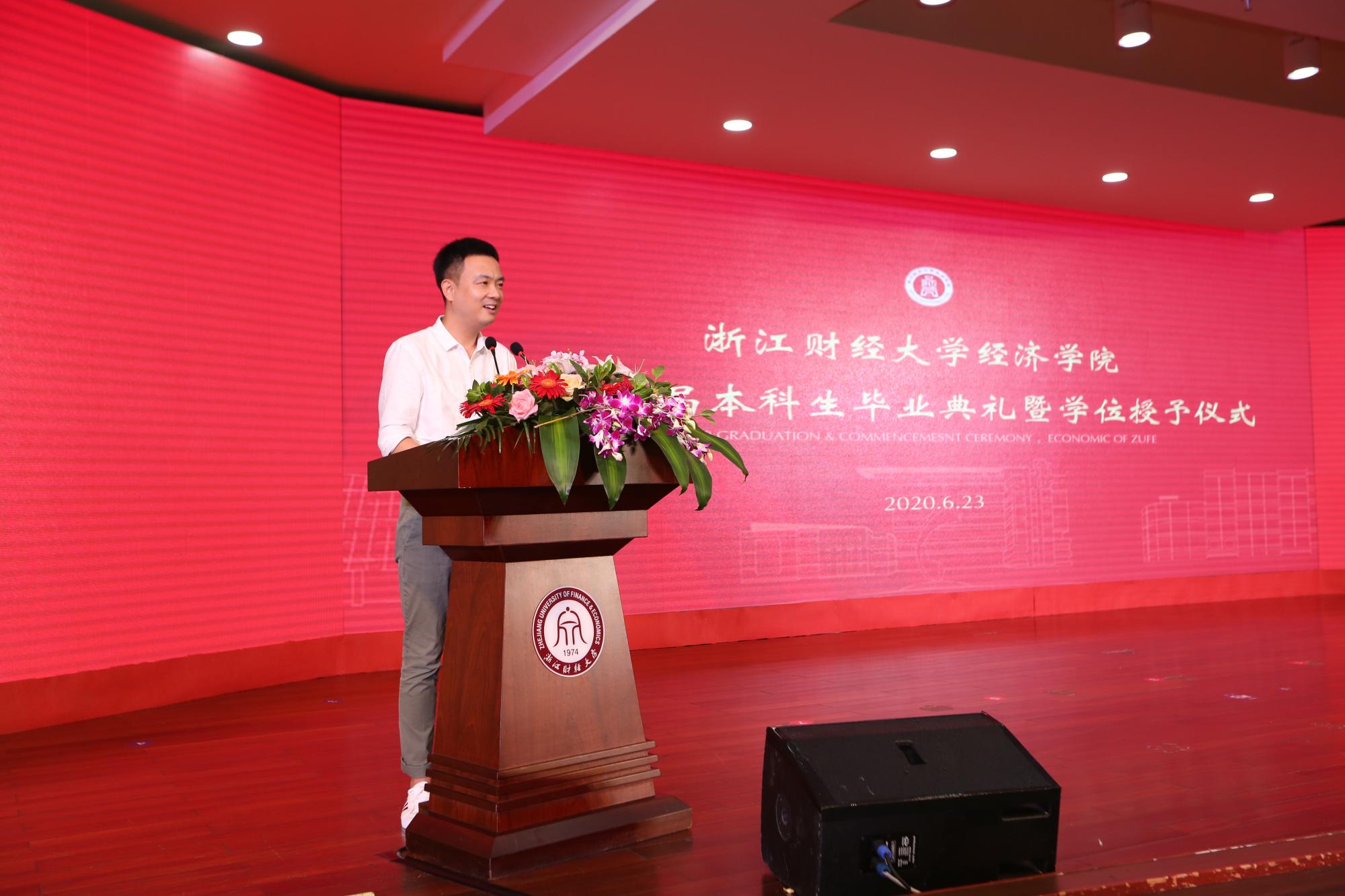 之后教师代表唐要家老师、毕业生代表谢安婷同学相继上台发言,表达了对全体毕业生诚挚的祝福,希望每一位同学能够在未来享受更加精彩的人生。唐要家老师谈到,不论何时都要保持进取的心态,永远怀着一颗谦卑之心,方能自由行走在这尘世之中;谢安婷同学则回顾了自己从刚入大学时的无所适从,到逐渐适应浙财的学习与生活,并通过自己不断地努力,走向了更大的舞台,成功考取复旦经院研究生得到深造机会的四年美好而又励志的经历。
