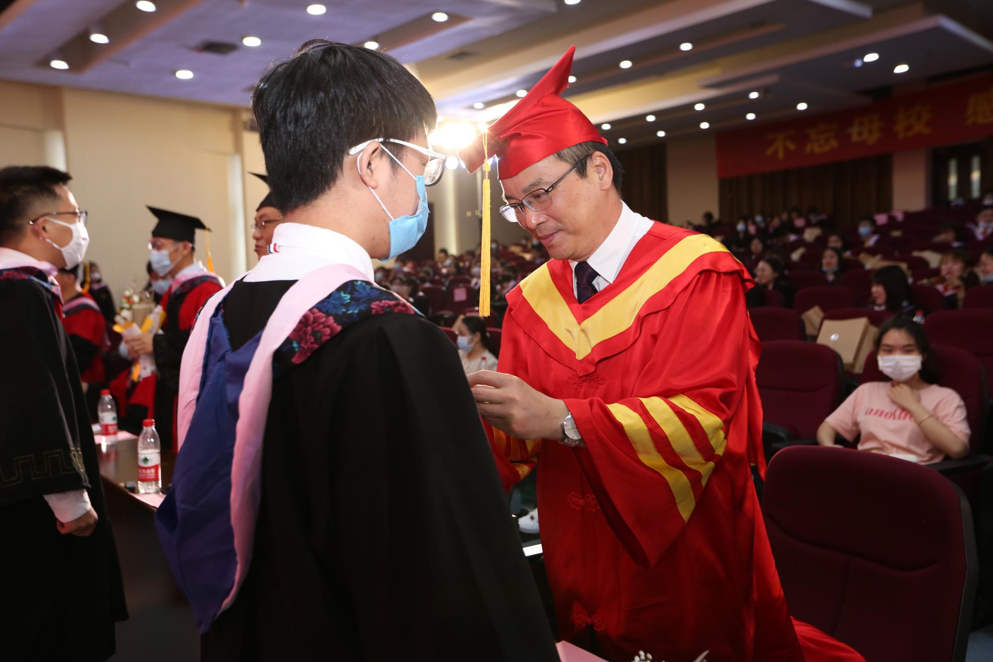 接着进行了隆重的学士学位颁授仪式,导师代表们上台为毕业生拨穗,完成学位授予。奋斗了四年的数百名学子,今朝如愿以偿完成学业,获得认可,报告厅内气氛达到高潮。