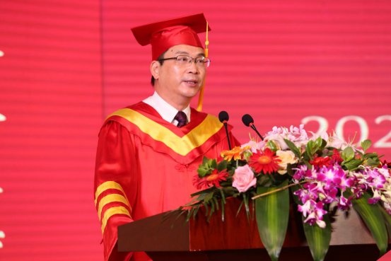 毕业典礼在庄严的国歌声中拉开序幕。校党委副书记余建森老师首先致辞,他向全体2020届毕业生致以真诚的祝贺,并语重心长地向毕业生们提出了三点期望:一是希望同学们坚守初心,勇立鸿鹄志向,二是希望同学们终身学习,与时代共成长,三是希望同学们认真生活,做幸福追梦人。最后,余建森书记对毕业生表达了不舍与期待,祝福所有毕业生一帆风顺,前程似锦。