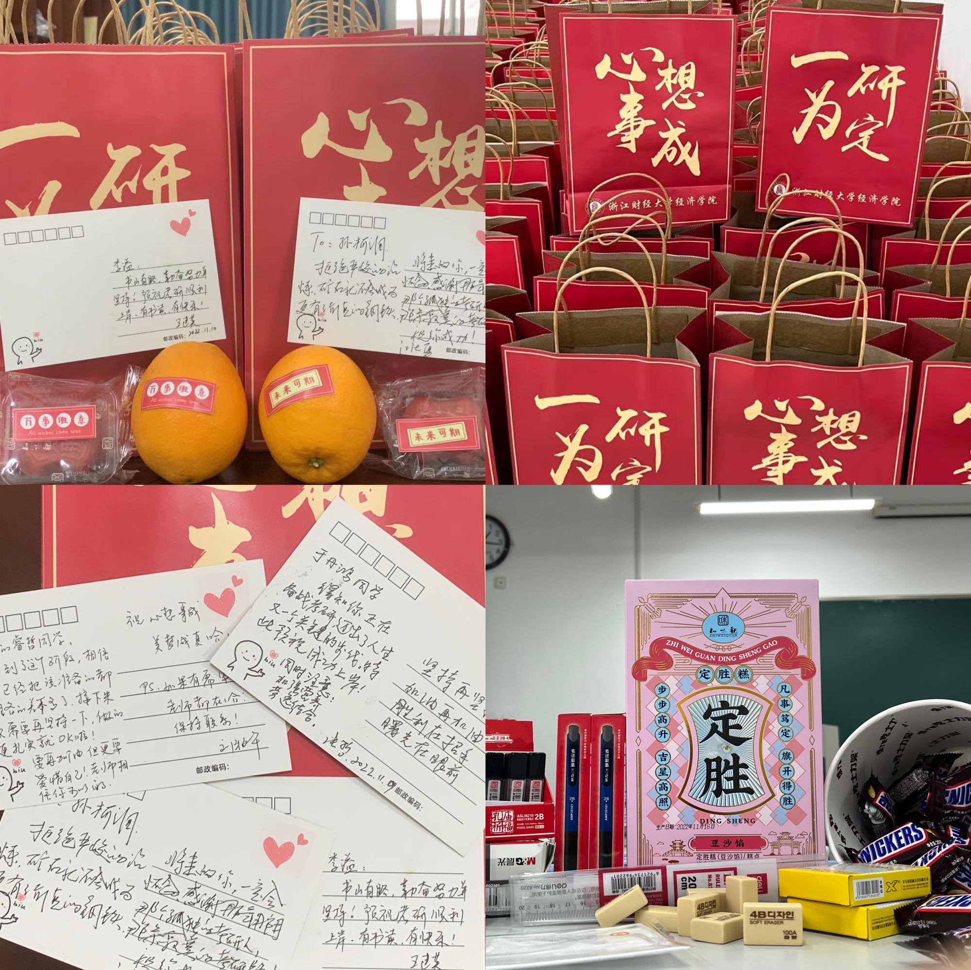 “加油包”中有寓意着“一研为定”的定胜糕、“心想事‘橙’”的甜橙,以及导师、辅导员的寄语明信片等物品,每一件都包含着对考研学生们的深切祝愿。