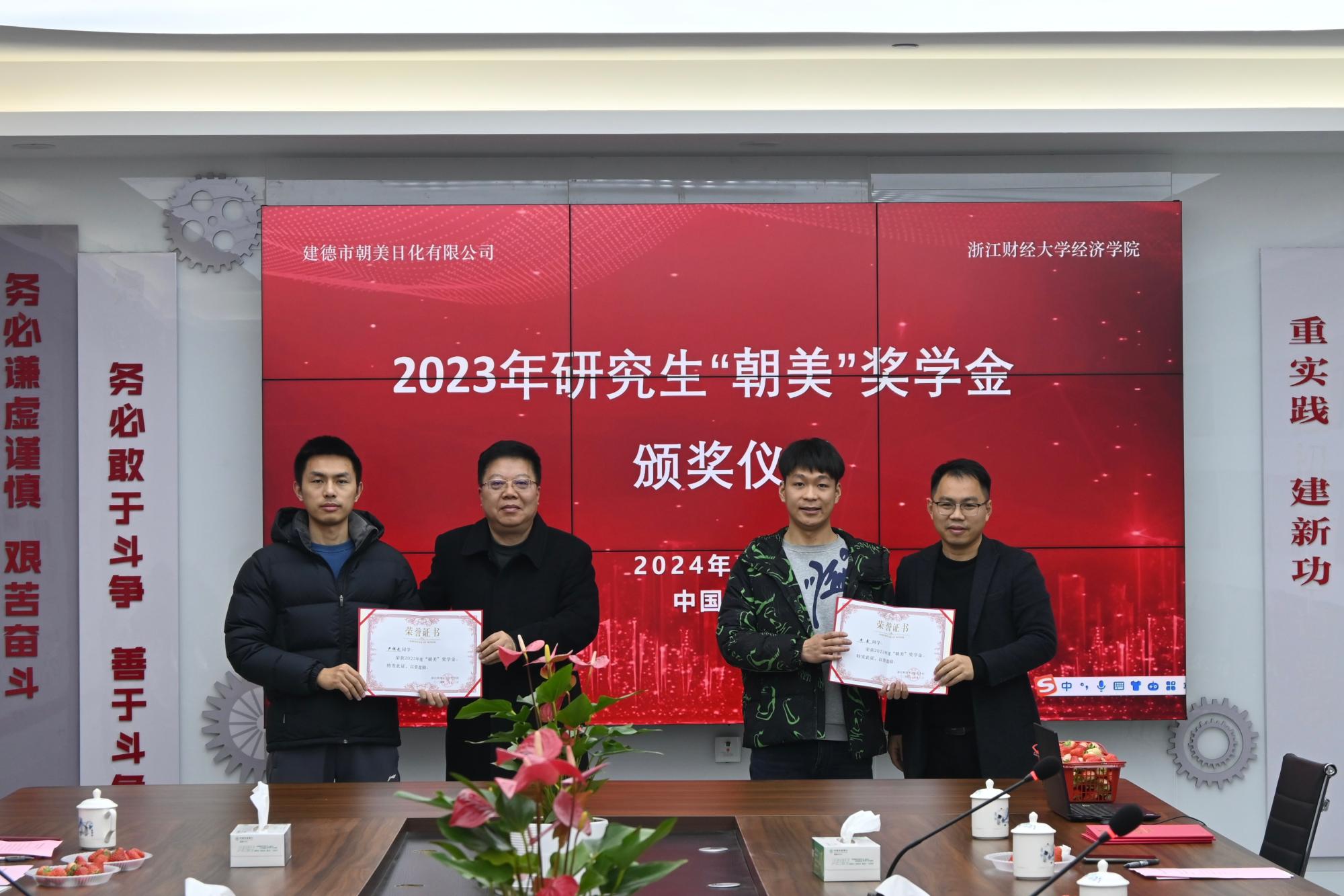 1月13日下午,第二届研究生“朝美”奖学金颁奖仪式在建德市朝美日化有限公司举行。建德市校友会秘书长胡志平,公司副总经理、学院创业导师朱利平、胡庆辉,以及学院院长罗俊,党委副书记徐丽玲,副院长王岭、副院长邓晓军等出席仪式并为获奖学生颁奖。活动由副院长邓晓军主持。