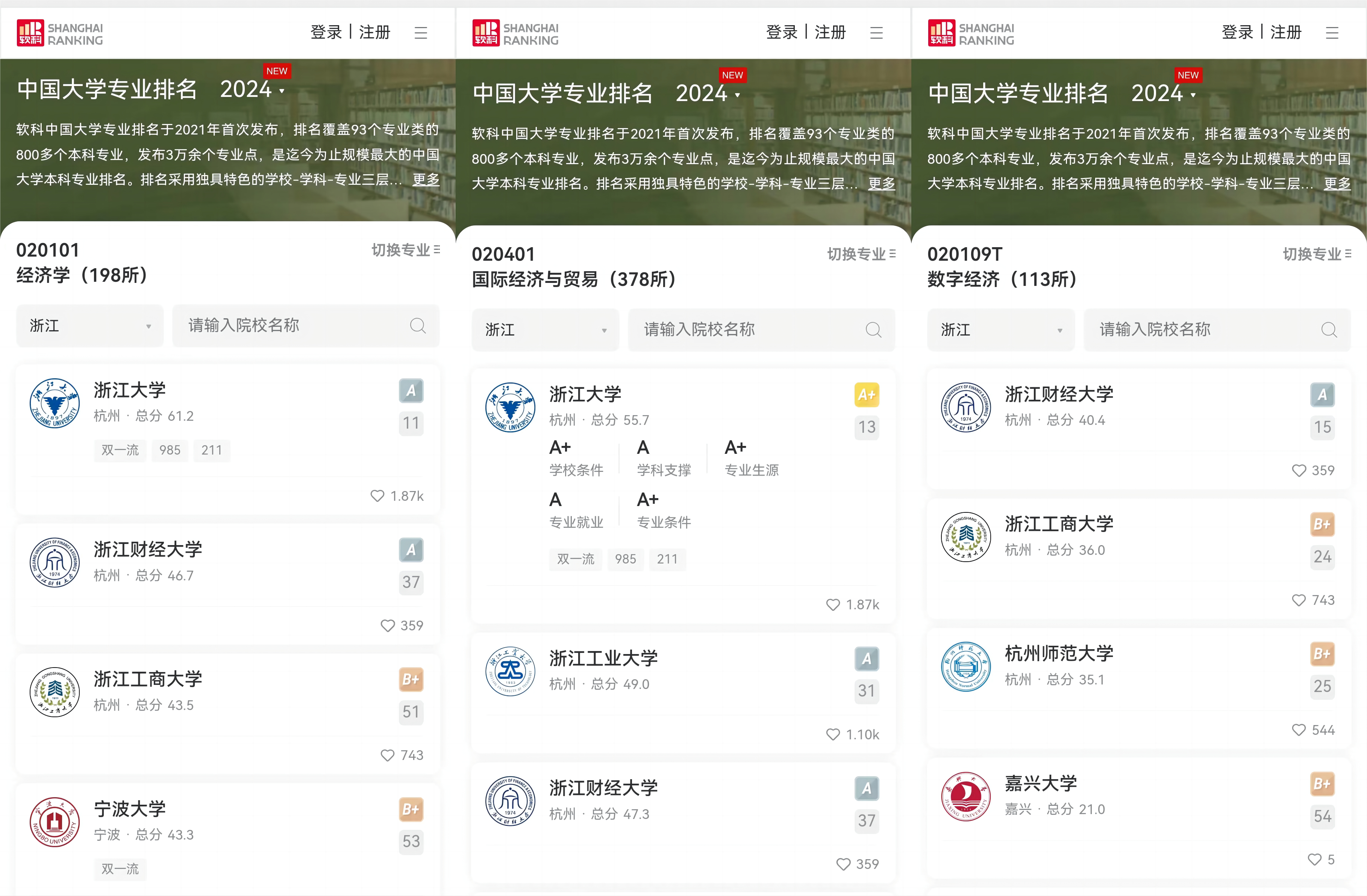 经济学、国际经济与贸易、数字经济三个本科专业再次同时上榜软科A类专业,经济学专业在全国排名第37,在浙江排名第2;国际经济与贸易专业在全国排名第37,在浙江排名第3;数字经济专业在全国排名第15,在浙江排名第1。