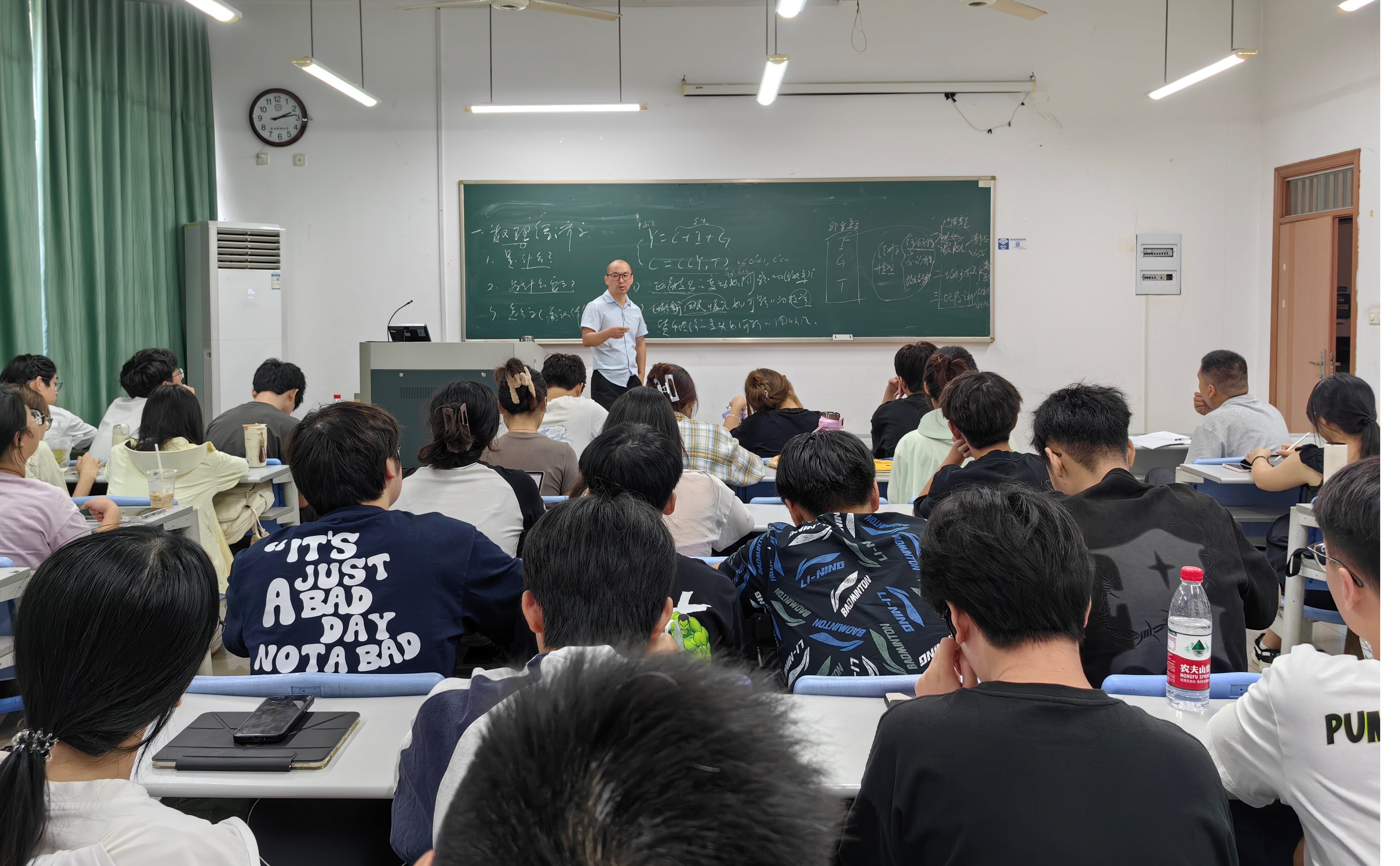 全程板书不代表随意乱写,邓燕飞老师上课伊始介绍本课程的参考资料时建议同学们多翻几本教材,而作为教师应像做科研时要做文献检索那样,应对《数理经济学》有全面而广泛地了解,比如国内外本课程的常见教材专著都有哪些,主要高校或著名学者如何安排相关教学内容,重点有哪些,难点怎么解读,时间怎么分配等等。此外,邓燕飞老师还认为,教学不应仅是找本教材照搬照抄地讲解,同样要像做科研一样应有所创新,或者是旧知识用新方式解读,或者是将教师的科研成果适时融入教学。本年度学校务虚会及理论学习上,校党委书记李金昌教授指出,当此AI已经盛行的数字新时代,书本上的不少知识学生通过网络平台就容易获得,甚至可以在网络上听到来自八方四海的学者不同风味的讲解,如果课堂上教师没有丝毫新意,没有一点创新,没有些许灼见,凭什么吸引学生抬头听、认真记、用心学。校长魏江教授也提出科教整合是赋予学生“终身选择权”的一种可行方式。授课期间,邓燕飞老师简要提及了他为上好本课程而花大心思、费老功夫准备的书稿,预计将于今年底或最晚于明年春正式出版。