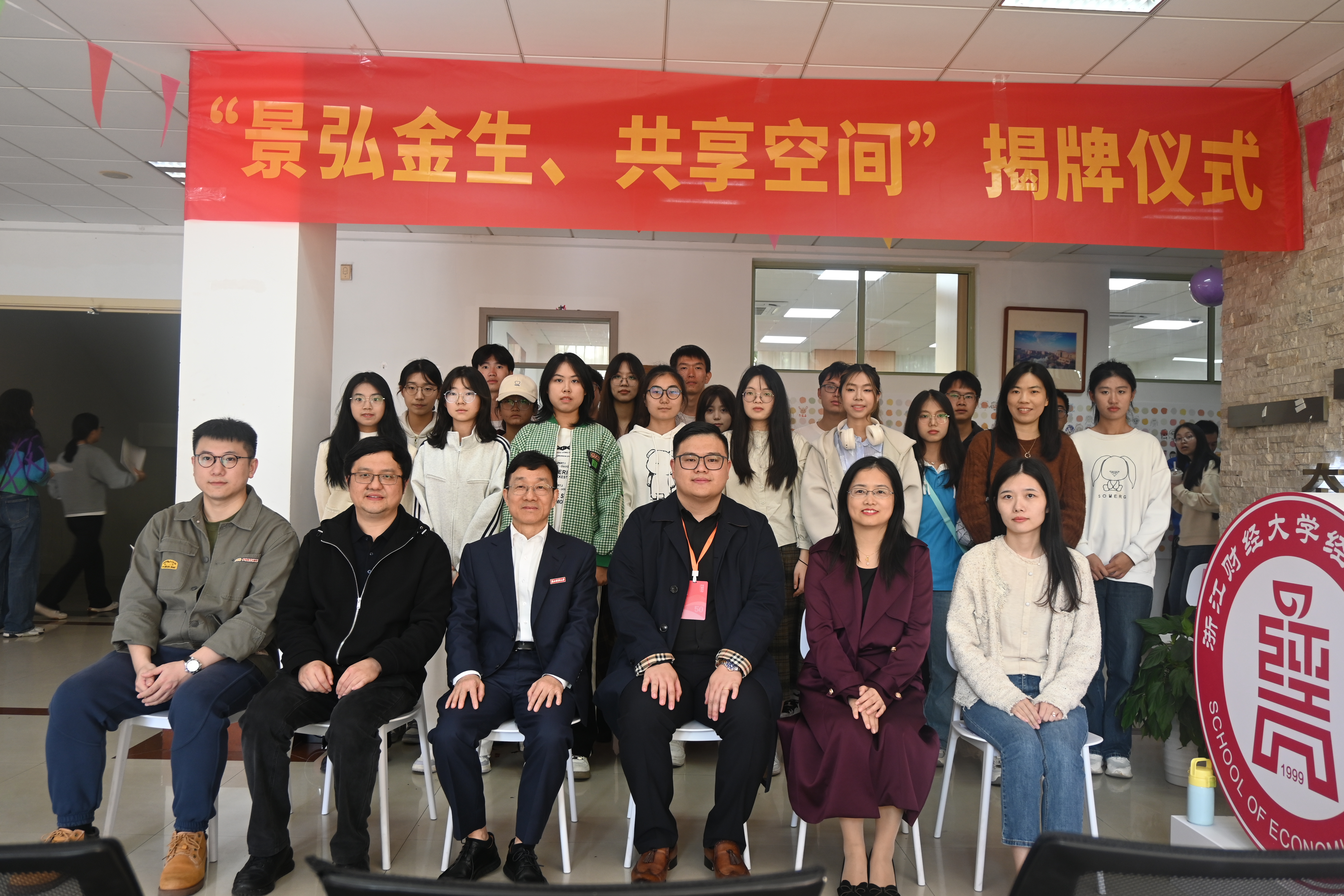 党委副书记徐丽玲主持。卢新波教授与王炀校友共同揭牌,标志着“景弘金生、共享空间”自习室正式启用。仪式上,徐奇伟书记指出,希望同学们充分利用学习空间、不断追求卓越。“景弘金生、共享空间”捐赠人14届国贸1班校友王炀则介绍了捐赠共享空间的初衷,勉励同学们砥砺前行、未来可期。