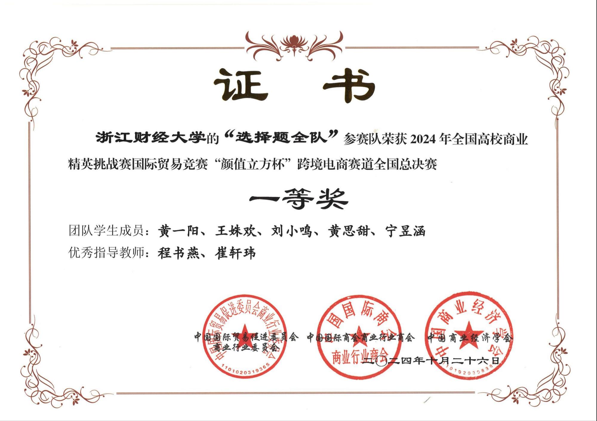 参赛团队“选择题全队”(学生成员:黄一阳、王姝欢、刘小鸣、黄思甜、宁昱涵;指导老师:程书燕、崔轩玮)以卓越的表现荣获本科组一等奖。