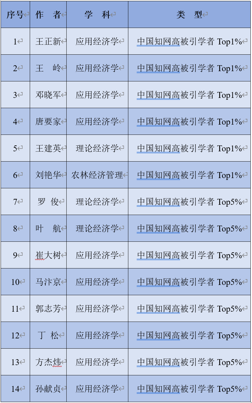 共14位教师入选。王正新教授、王岭教授、邓晓军教授、唐要家教授、王建英副教授、刘艳华副教授分别入选应用经济学、理论经济学和农林经济管理学科“中国知网高被引学者Top1%”;罗俊教授、叶航教授、崔大树教授、马汴京教授、郭志芳副教授、丁松副教授、方杰炜博士、孙献贞博士分别入选理论经济学、应用经济学学科“中国知网高被引学者Top5%”。