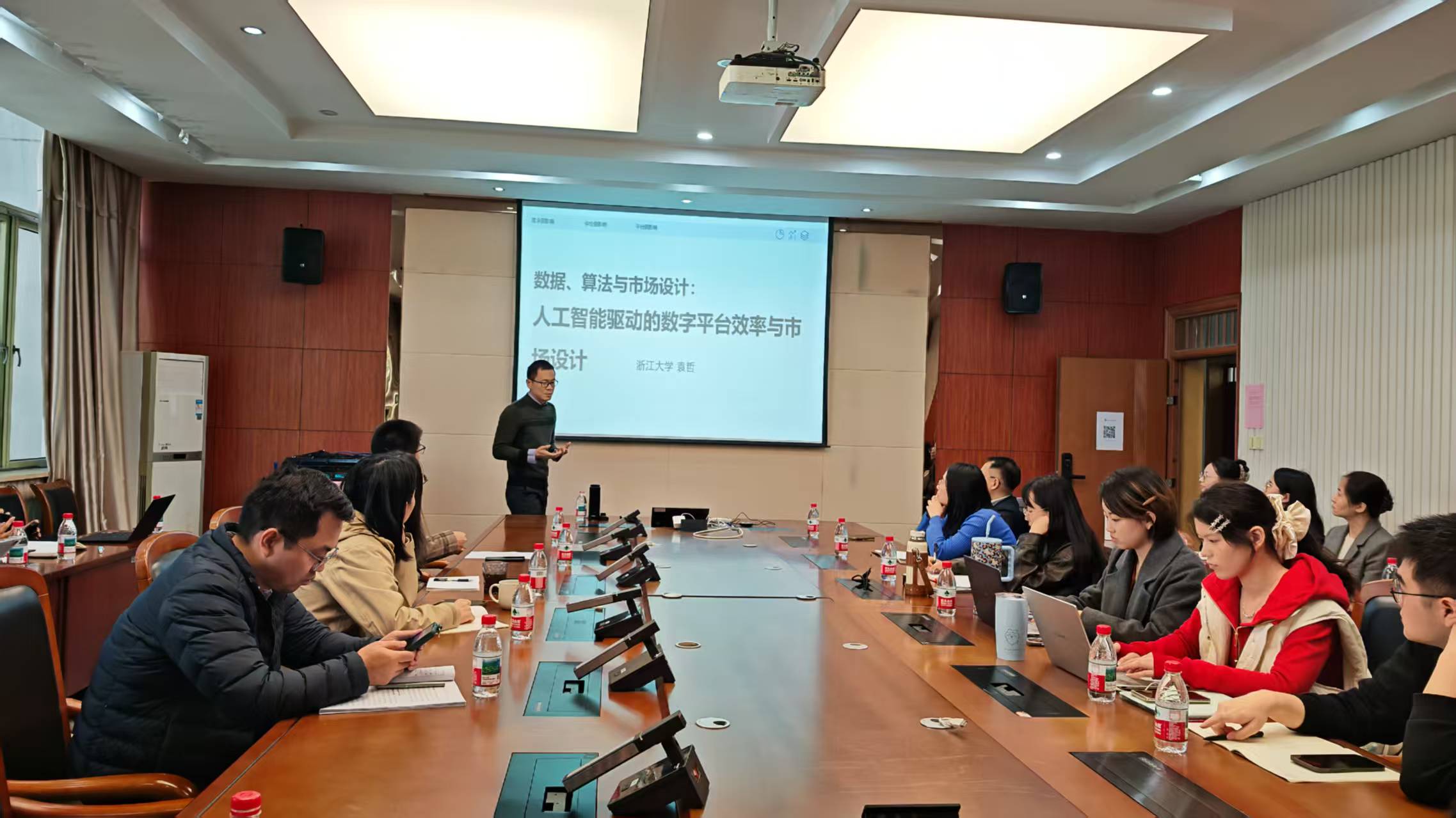 “百人计划”研究员袁哲博士担任主讲嘉宾,为师生带来题为“数据、算法与市场设计:人工智能驱动的数字平台效率与市场设计”的专题报告。院长罗俊、副院长邓晓军及学院师生30余人参加了本次活动。
