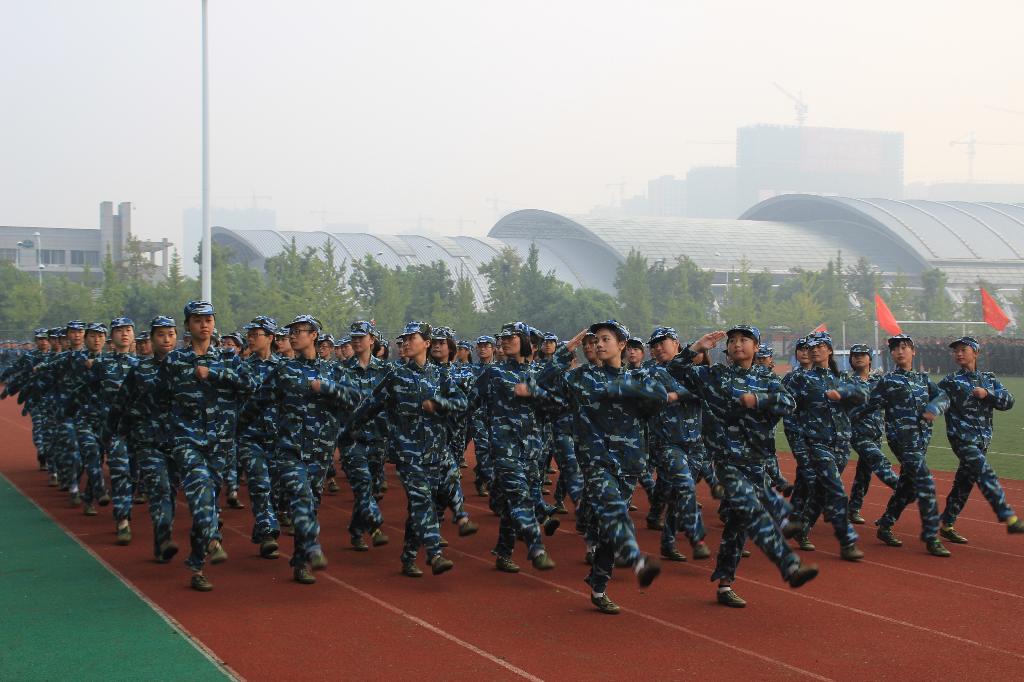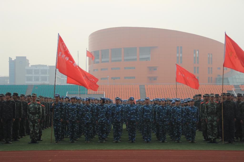 新生们早早地在操场列队,等待阅兵式的开始。清晨的阳光洒在他们的迷彩服上,柔和而坚韧。迎军旗、升国旗之后,军训师师长问候军训新生:“同学们辛苦了!”“为学校争光!”铿锵有力的回答响彻整个校园。