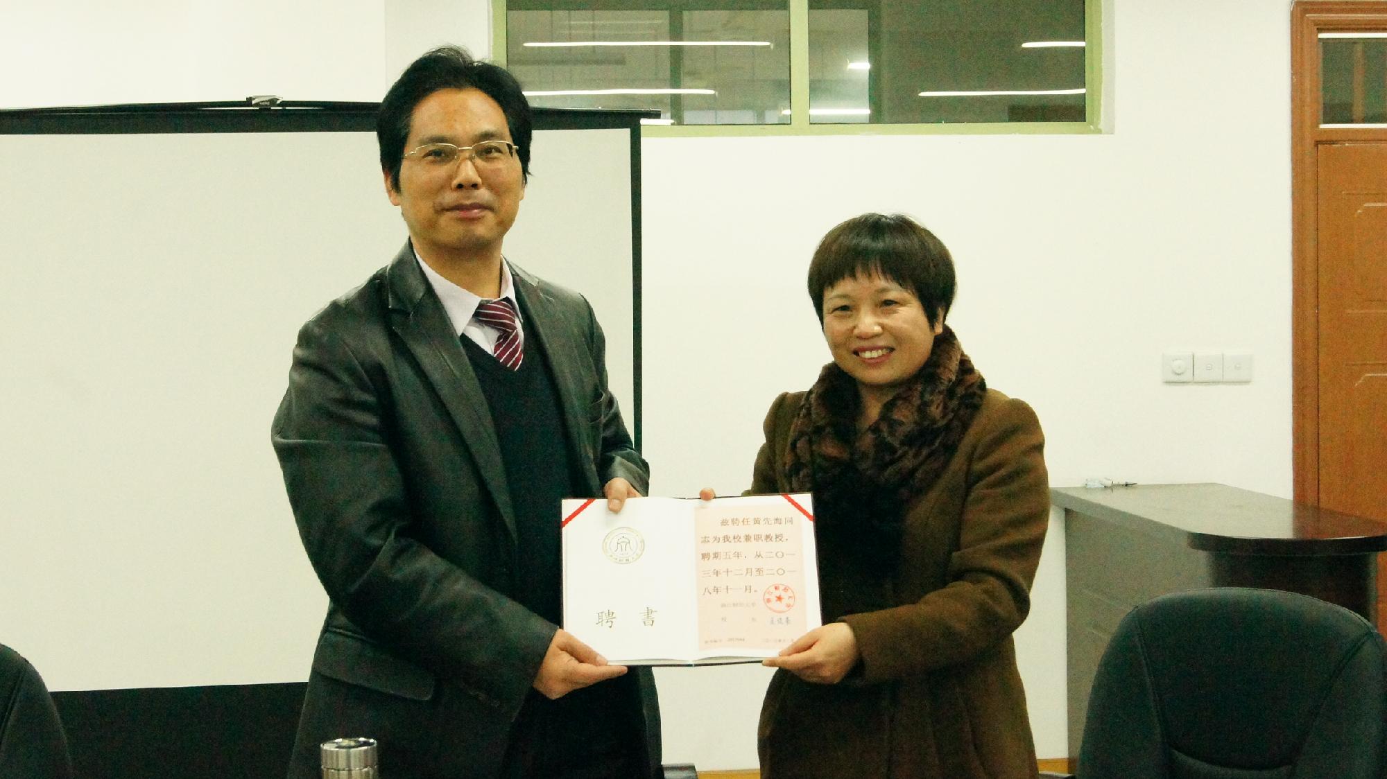 12月17日下午,浙江大学成人直播 常务副院长、浙江省国际贸易学会会长黄先海教授受聘为我校兼职教授,并在经贸学院楼304室对成人直播 的学科发展进行指导,胡亦琴院长为黄先海教授颁发了聘任证书。