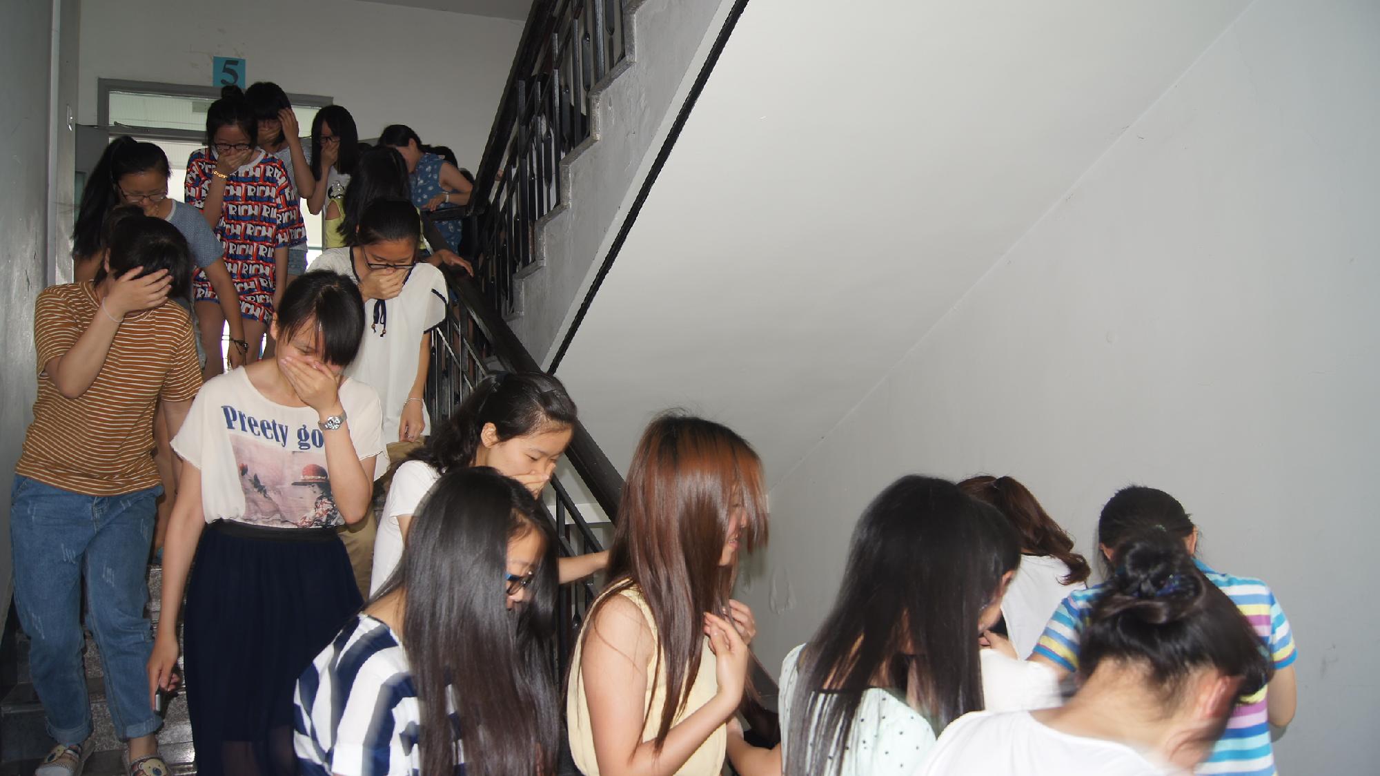 中午12点30分,警报声突然响起,各班辅导员和班委马上组织学生,迅速进入紧急疏散状态:在辅导员的带领下,全体学生用手捂住口鼻有序撤出寝室;楼层引导员指明师生的疏散方向,楼梯拐角安全员在高声的提醒师生,按照逃生演练方案设定的逃生路线,迅速而有序地从各寝室撤离到指定位置。整个应急演练活动规范、有序、紧凑、安全、高效,老师和同学们临危不乱,组织有序,逃生时没有发生拥挤、踩踏和碰伤学生的事故。