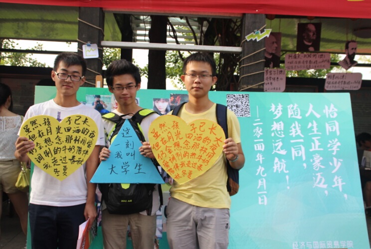 迎风飞扬的彩旗,鲜艳的欢迎横幅,以及众多经济学家的照片和简介,让整个迎新氛围温馨而舒适。此次迎新,经贸学院特别推出了爱心笑脸墙合影活动,为新生们拍下进入大学的第一张照片,让所有经贸新生和家长一同体会上大学的喜悦。“恰同学少年,人生正豪迈,随我一同,梦想远航”,爱心墙上的标语也正是新生们此时此刻的心情。