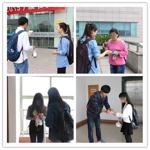 团委学生会每天早上7点半至8点半这个时间段组织志愿者在教学楼、图书馆各门前执勤,通过宣传海报,派发提示卡等形式,提醒同学们不要将食品带入教室。同时,通过线上微信平台宣传、线下现场投票的形式票选出大家心目中“无饮食教室”的劝阻手势和标语,希望以这种形式让更多同学参与到“无饮食教室”的活动中进来。