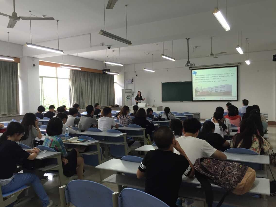 5月14日上午,戴魁早老师的课程《产业组织理论》迎来了一位特殊的老师,浙江诺尔康神经电子科技股份有限公司副总经理沈晓霞女士应邀来我校开展题为“海外融资和海外并购”的“基地精英进课堂”活动,2012级、2013级经济学专业参加了本次活动。此次活动由柴志贤副院长主持。