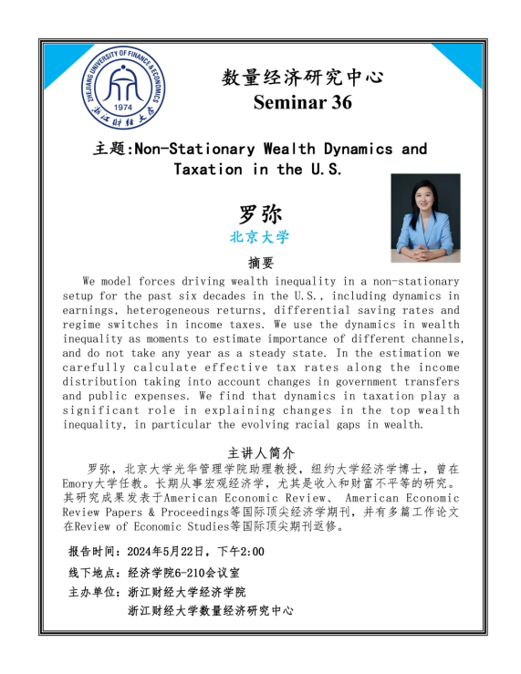 罗弥,北京大学光华管理学院助理教授,纽约大学经济学博士,曾在Emory大学任教。长期从事宏观经济学,尤其是收入和财富不平等的研究。其研究成果发表于American Economic Review、 American Economic Review Papers & Proceedings等国际顶尖经济学期刊,并有多篇工作论文在Review of Economic Studies等国际顶尖期刊返修。