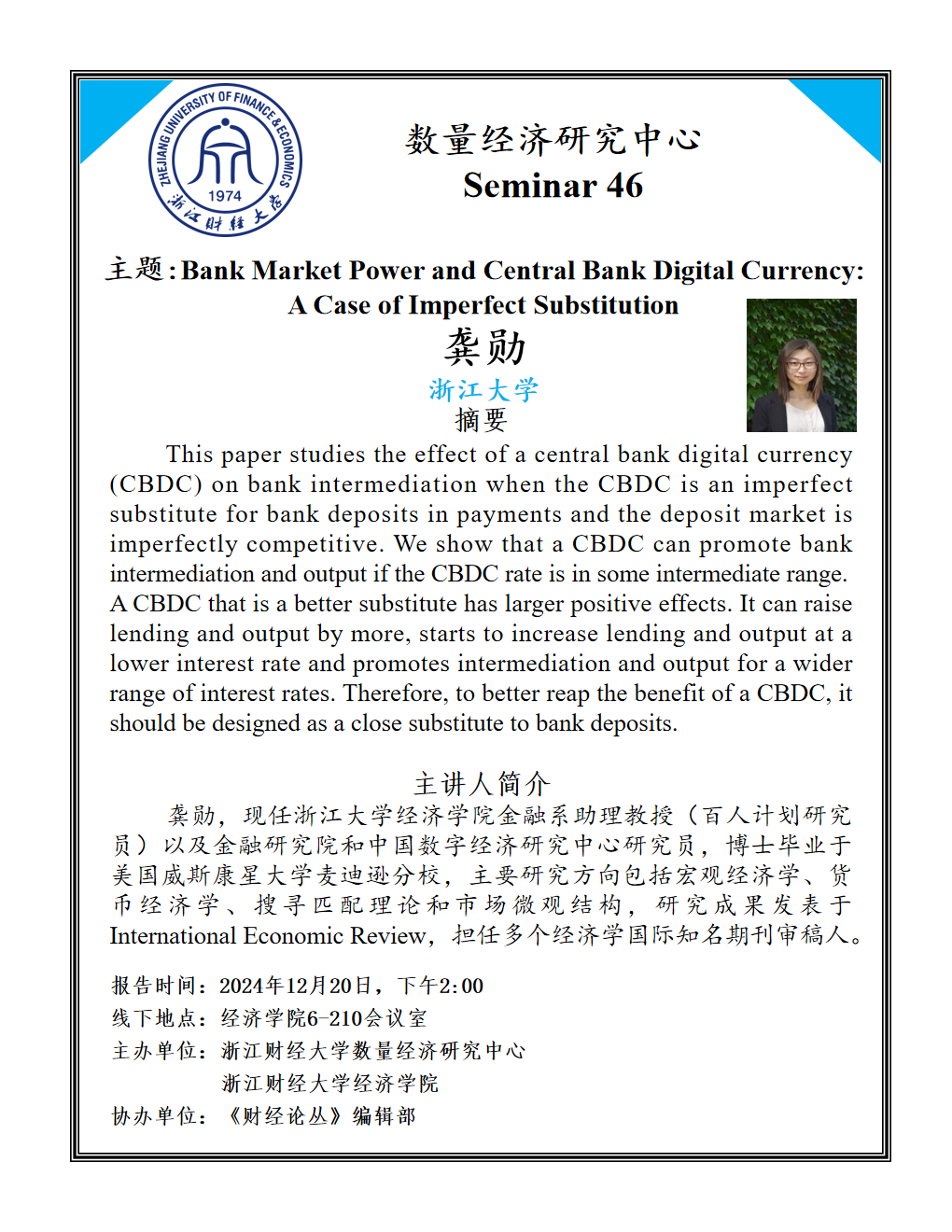 金融系助理教授(百人计划研究员)以及金融研究院和中国数字经济研究中心研究员,博士毕业于美国威斯康星大学麦迪逊分校,主要研究方向包括宏观经济学、货币经济学、搜寻匹配理论和市场微观结构,研究成果发表于International Economic Review,担任多个经济学国际知名期刊审稿人。