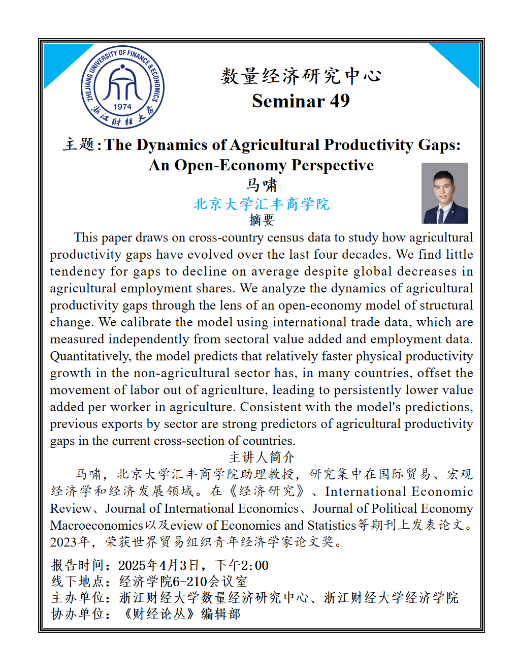 马啸,北京大学汇丰商学院助理教授,研究集中在国际贸易、宏观经济学和经济发展领域。在《经济研究》、International Economic Review、Journal of International Economics、Journal of Political Economy Macroeconomics以及eview of Economics and Statistics等期刊上发表论文。2023年,荣获世界贸易组织青年经济学家论文奖。