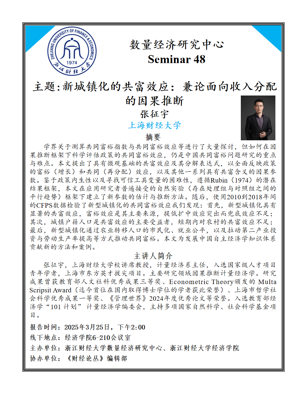 张征宇,上海财经大学校讲席教授,计量经济系主任,入选国家级人才项目青年学者,上海市东方英才拔尖项目。主要研究领域因果推断计量经济学。研究成果曾获教育部人文社科优秀成果三等奖、Econometric Theory颁发的 Multa Scripsit Award(迄今首位在国内取得博士学位的学者获此荣誉)、上海市哲学社会科学优秀成果一等奖、《管理世界》2024年度优秀论文等荣誉。入选教育部经济学“101 计划” 计量经济学编委会,主持多项国家自然科学、社会科学基金项目。