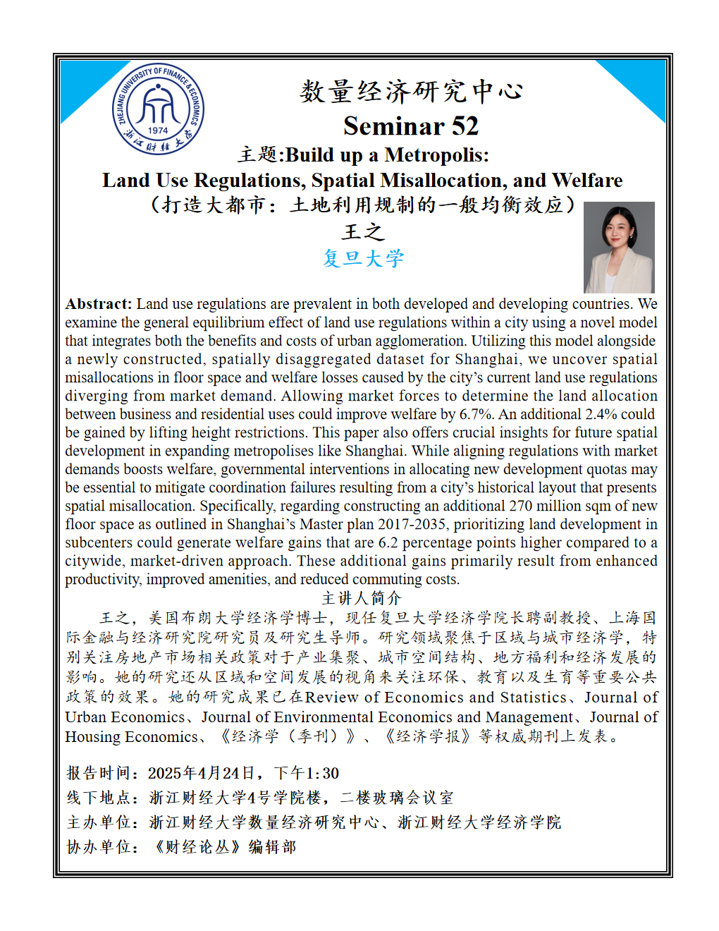Abstract: Land use regulations are prevalent in both developed and developing countries. We examine the general equilibrium effect of land use regulations within a city using a novel model that integrates both the benefits and costs of urban agglomeration. Utilizing this model alongside a newly constructed, spatially disaggregated dataset for Shanghai, we uncover spatial misallocations in floor space and welfare losses caused by the city’s current land use regulations diverging from market demand. Allowing market forces to determine the land allocation between business and residential uses could improve welfare by 6.7%. An additional 2.4% could be gained by lifting height restrictions. This paper also offers crucial insights for future spatial development in expanding metropolises like Shanghai. While aligning regulations with market demands boosts welfare, governmental interventions in allocating new development quotas may be essential to mitigate coordination failures resulting from a city’s historical layout that presents spatial misallocation. Specifically, regarding constructing an additional 270 million sqm of new floor space as outlined in Shanghai’s Master plan 2017-2035, prioritizing land development in subcenters could generate welfare gains that are 6.2 percentage points higher compared to a citywide, market-driven approach. These additional gains primarily result from enhanced productivity, improved amenities, and reduced commuting costs.