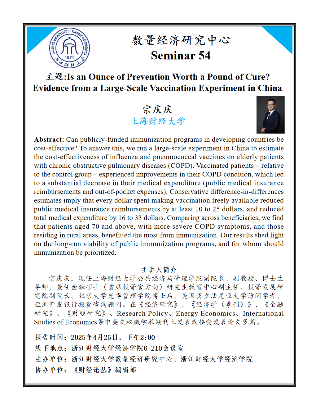 Abstract:Can publicly-funded immunization programs in developing countries be cost-effective? To answer this, we run a large-scale experiment in China to estimate the cost-effectiveness of influenza and pneumococcal vaccines on elderly patients with chronic obstructive pulmonary diseases (COPD). Vaccinated patients – relative to the control group – experienced improvements in their COPD condition, which led to a substantial decrease in their medical expenditure (public medical insurance reimbursements and out-of-pocket expenses). Conservative difference-in-differences estimates imply that every dollar spent making vaccination freely available reduced public medical insurance reimbursements by at least 10 to 25 dollars, and reduced total medical expenditure by 16 to 33 dollars. Comparing across beneficiaries, we find that patients aged 70 and above, with more severe COPD symptoms, and those residing in rural areas, benefitted the most from immunization. Our results shed light on the long-run viability of public immunization programs, and for whom should immunization be prioritized.