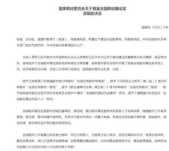 10月12日,国家教材委员会公布了首届全国教材建设奖评选结果,由成人直播