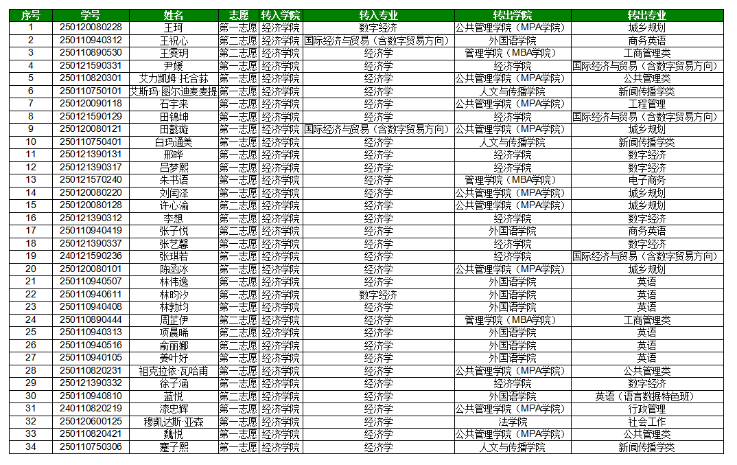 根据学生个人填报、学院按照条件进行筛选审核等,经学院研究决定,同意30位同学准入至经济学专业,2位同学准入至国际经济与贸易(含数字贸易方向)专业,2位同学准入至数字经济专业。