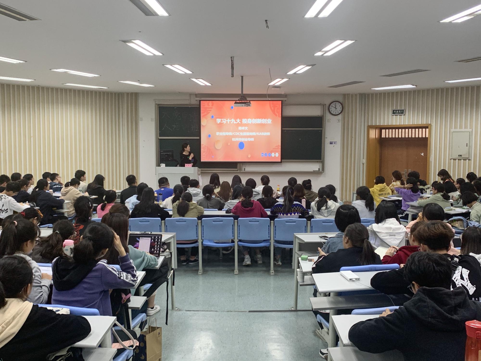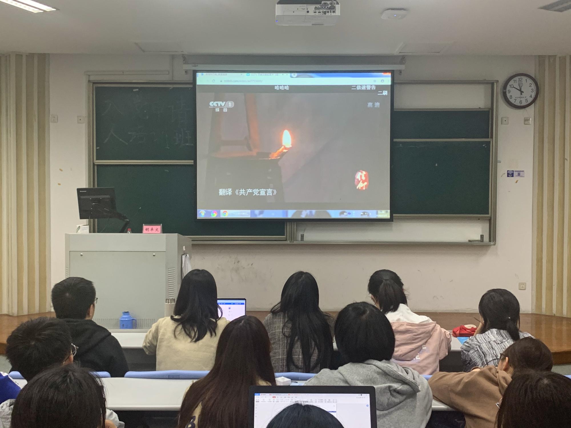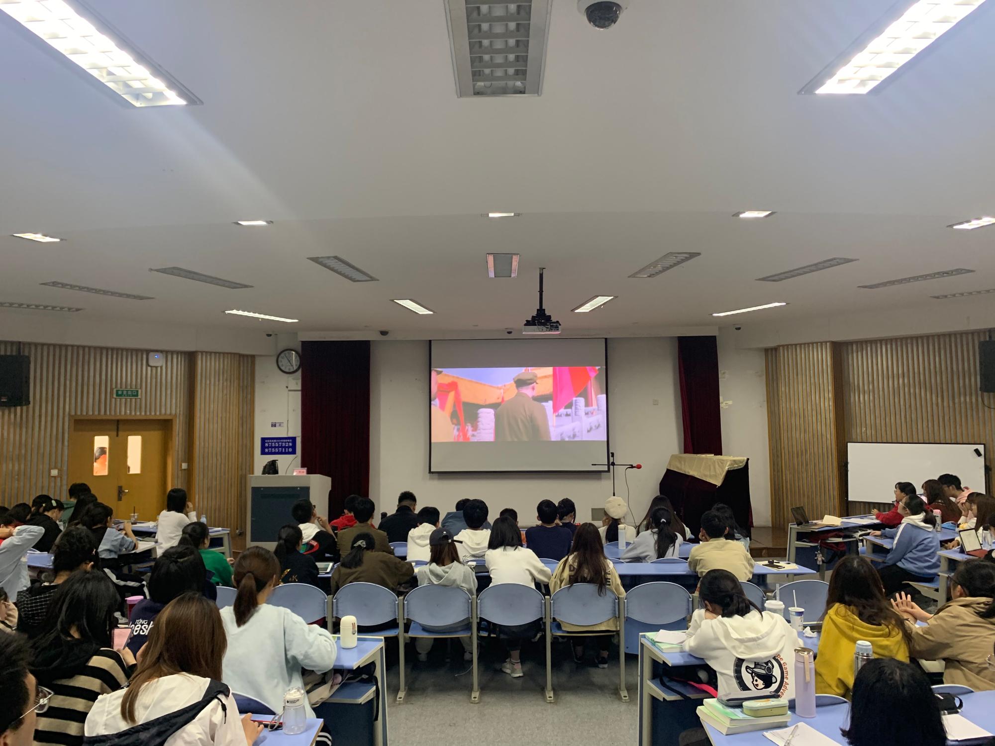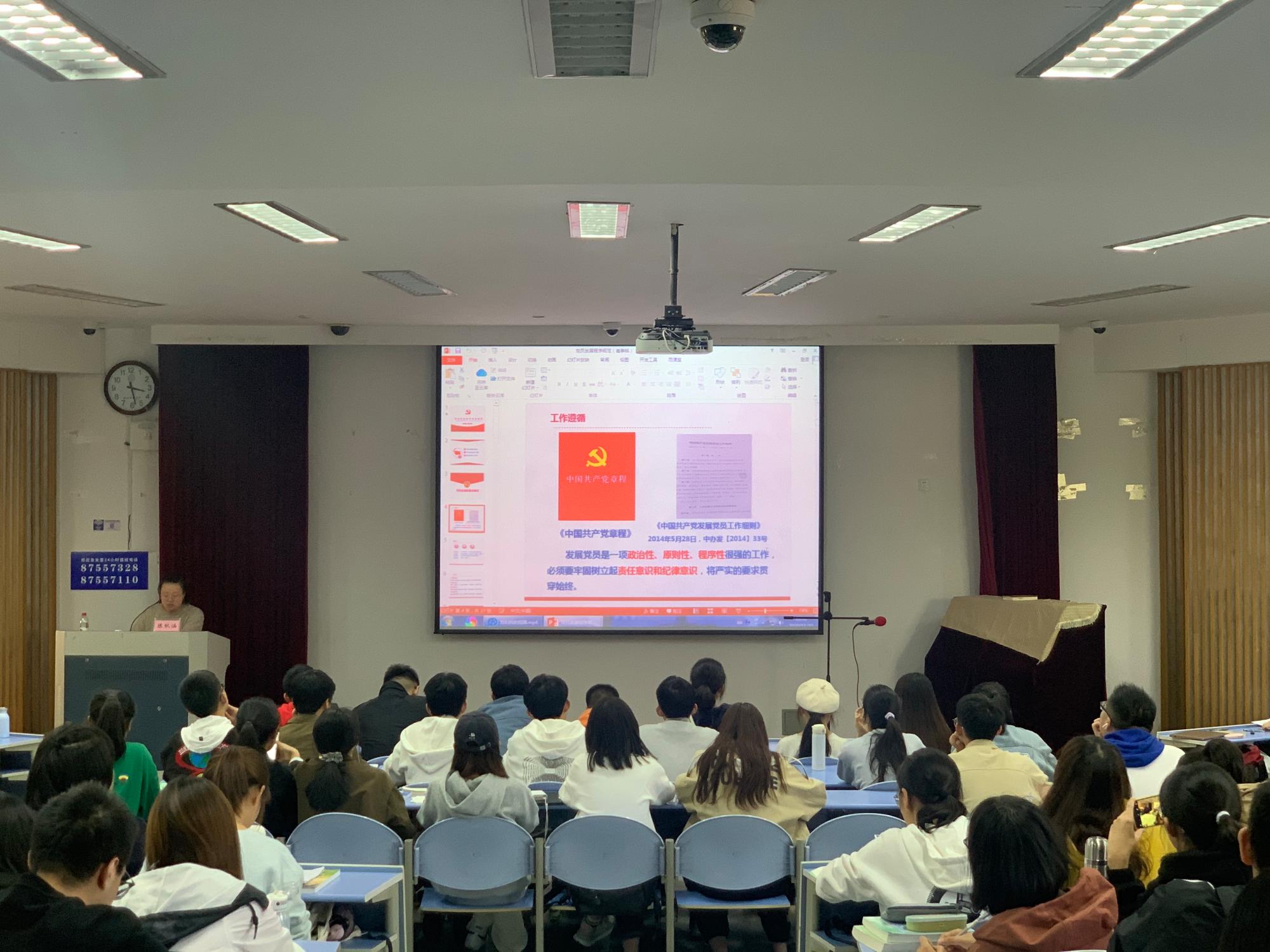 负责学生党建工作的陈秋涵为大家授课。老师们分别从党员发展流程规范、党史、解读十九大精神等方面进行讲授,希望同学们能够明确入党动机、坚定理想信念,在各个方面严格要求自己。在红色观影课程中,历史文献纪录片《信仰》和主题教育片《我和我的祖国》进一步引导同学们发挥先锋模范作用,激发了同学们的家国情怀。