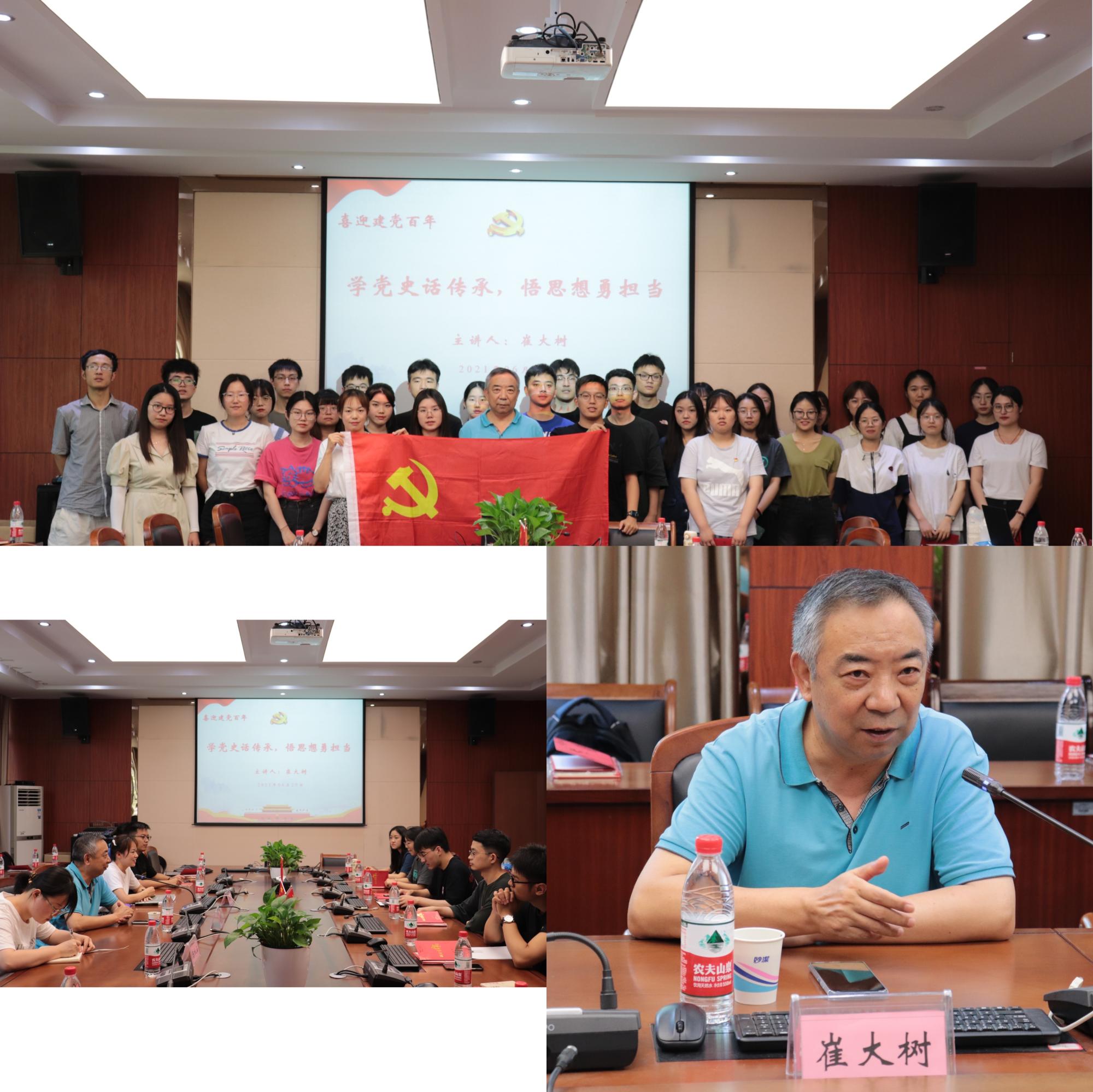 学党史话传承,悟思想勇担当。学院邀请有着26年党龄的老党员崔大树教授为学生党员上了一堂主题鲜明、精彩生动、发人深省的党课,通过线上与线下相结合的形式,将先辈们的革命故事与身边共产党员的动人事迹相结合,带领同学们回顾了党的光荣历史、优良传统、伟大成就,紧密结合新时代浪潮下的信念传承与责任担当,引导鼓励学生党员在鉴往知来中牢记初心使命,在砥砺前行中赓续红色血脉。