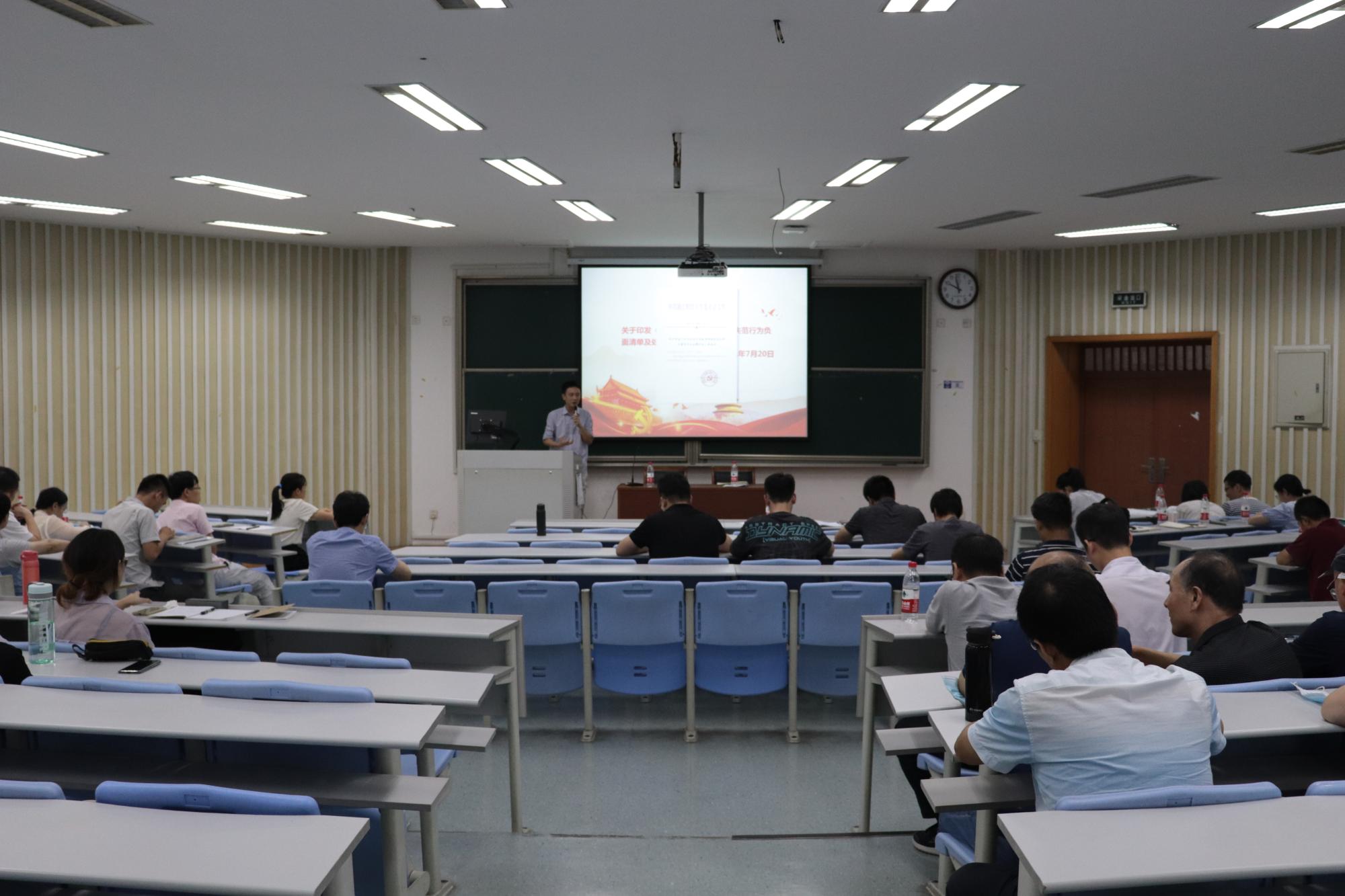 教师师德失范行为负面清单及处理办法》中提出的思想政治素质、教育教学行为等5个方面的负面清单和三级处理办法进行了分析解读,并介绍了文件制定的有关背景、学院领导班子前期对文件进行学习讨论的情况以及下一阶段落实推进工作的思路和建议。