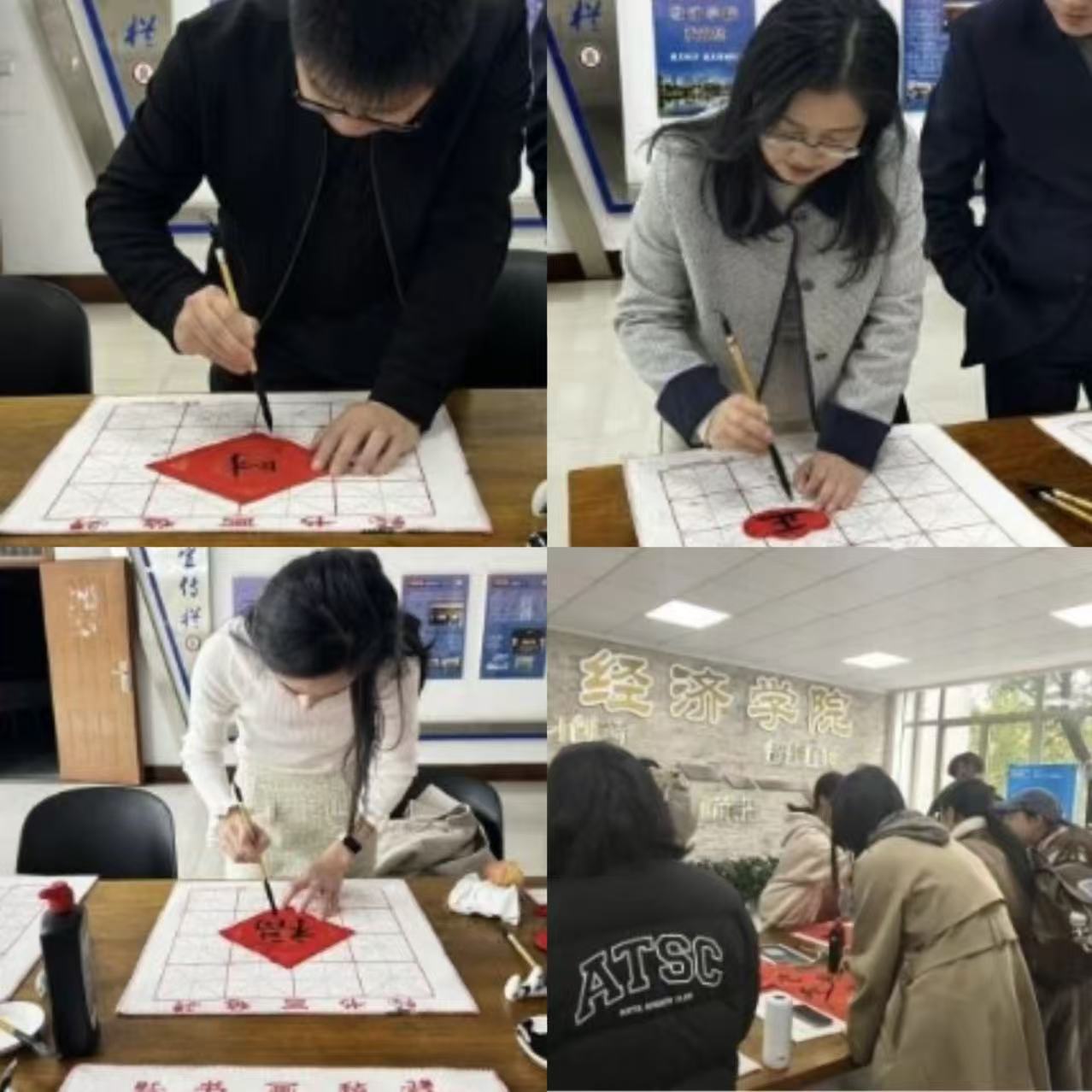 一楼大厅墨香四溢,气氛热烈。此次活动吸引了众多师生驻足参与,既有治学严谨的学院教师,也有朝气蓬勃的青年学子。大家齐聚一堂,以笔为媒,以墨为鉴,共同书写心中的“廉”意。