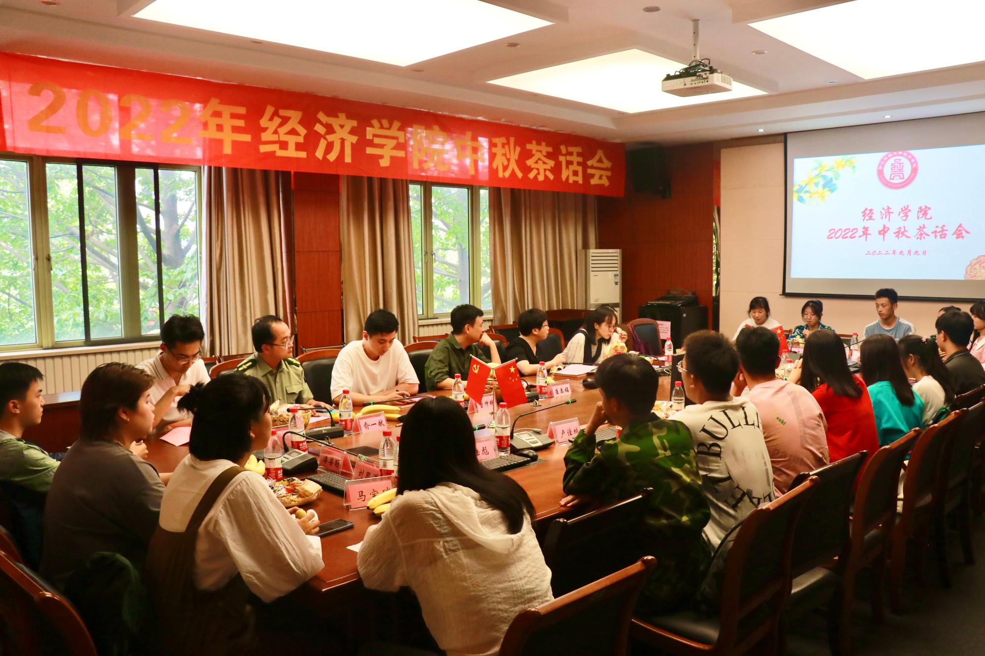 2022年中秋茶话会于学院楼210会议室圆满举办。学院党委书记胡亦琴、党委副书记崔泰铭、学生工作办公室主任李伶俐、团委书记曹仲晔、辅导员邓斯怡、俞一献、陈秋涵、李皓,以及2022级本科新生代表欢聚一堂,庆祝佳节。