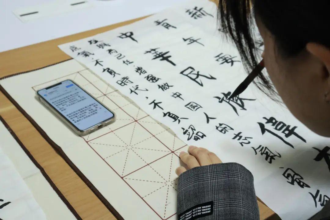 为了让同学们有更加身临其境的体会到书法的魅力和乐趣,,曹老师亲自进行了示范,同学们也是认真观看学习。随后,同学们也是亲自感受了书法,纷纷挥毫泼墨,或用流利劲爽的草书、行书,或用沉郁厚实的篆书、隶书进行了练习。