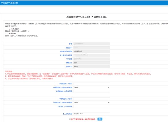 ①学生登陆教务管理系统,按照自愿原则,在“信息维护--学生监护人信息采集”中填写父母或监护人信息。学生可以填报父母双方信息,也可以只填报一方信息。填写完成后点击提交。