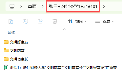 请申请 “文明寝室”“文明寝室长”“文明好室友”同学填写各类申报表(附件1、附件2、附件3、附件4),附加证明材料。各位寝室长收齐,文件夹命名为“寝室长姓名+班级+寝室号”(例:张三+24经济学1+31#101),文件夹内分别以 “文明寝室”“文明寝室长”“文明好室友”分类整理,并于2025年11月20日中午12点前发送至邮箱[email protected]。