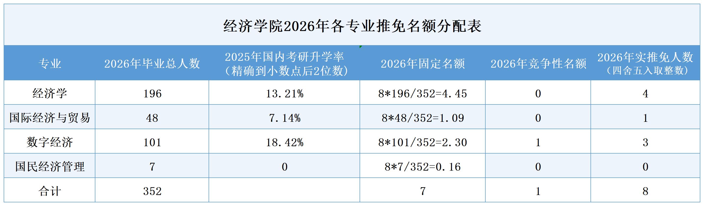 固定名额共7人,其中经济学专业4人,国际经济与贸易专业1人,数字经济专业2人。剩余1人为竞争性名额,该名额优先分配给上一年度国内考研升学率最高的专业,成人直播